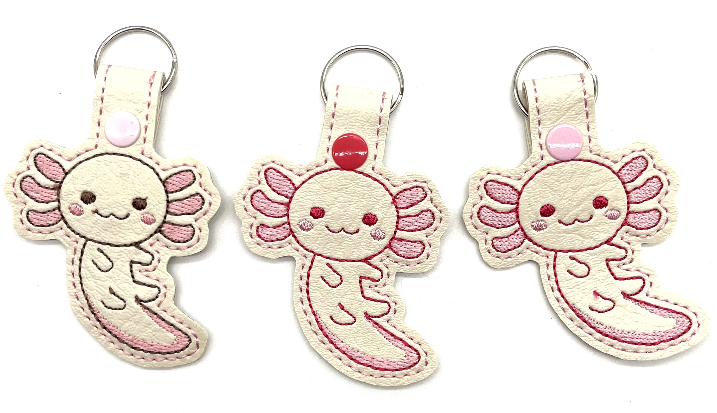 Faux leather embroidered keyfob, cut and assembled by hand.