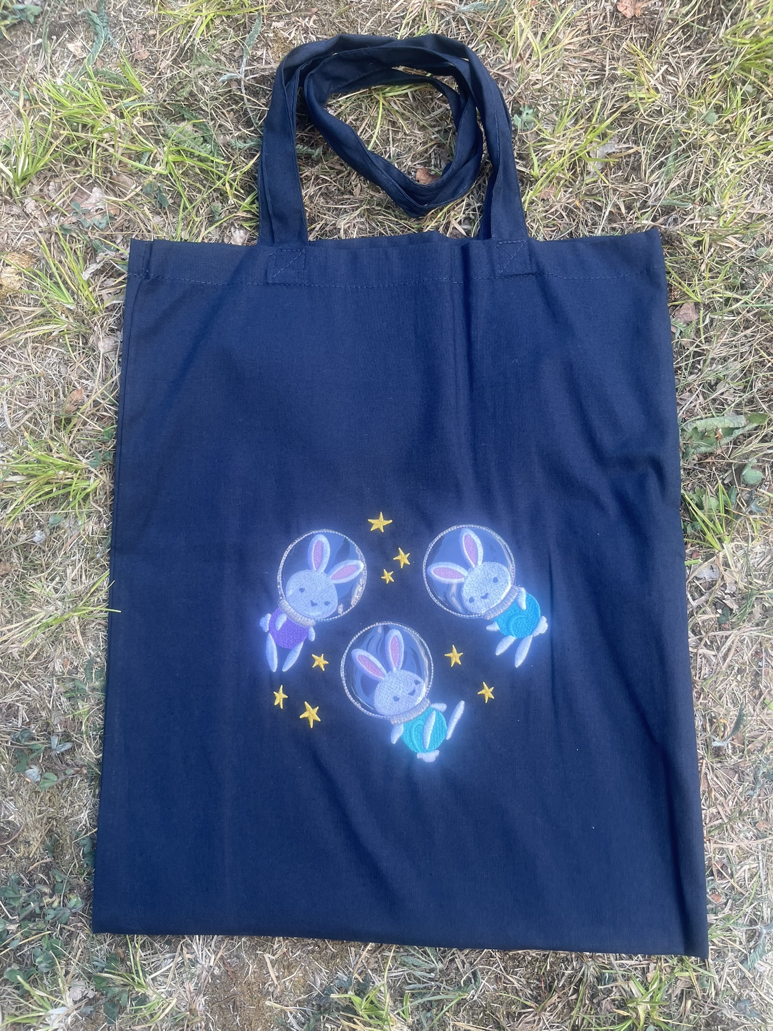 Choose this cute design on any of our coloured bags (pictured on navy).