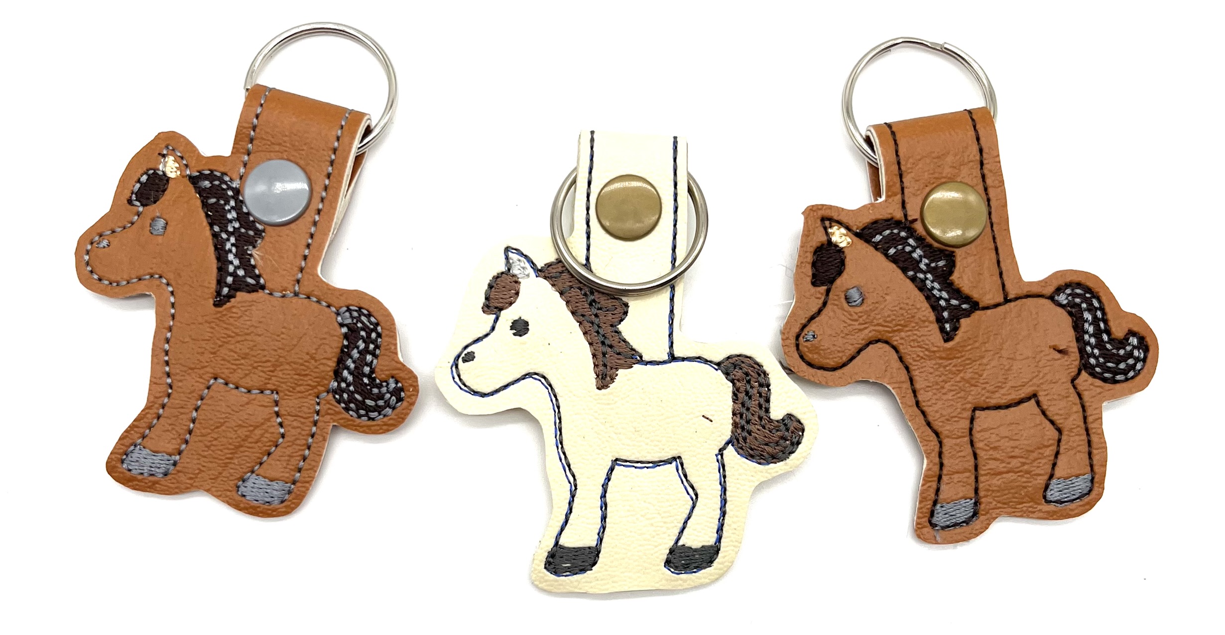 Faux leather embroidered keyfob, cut and assembled by hand.