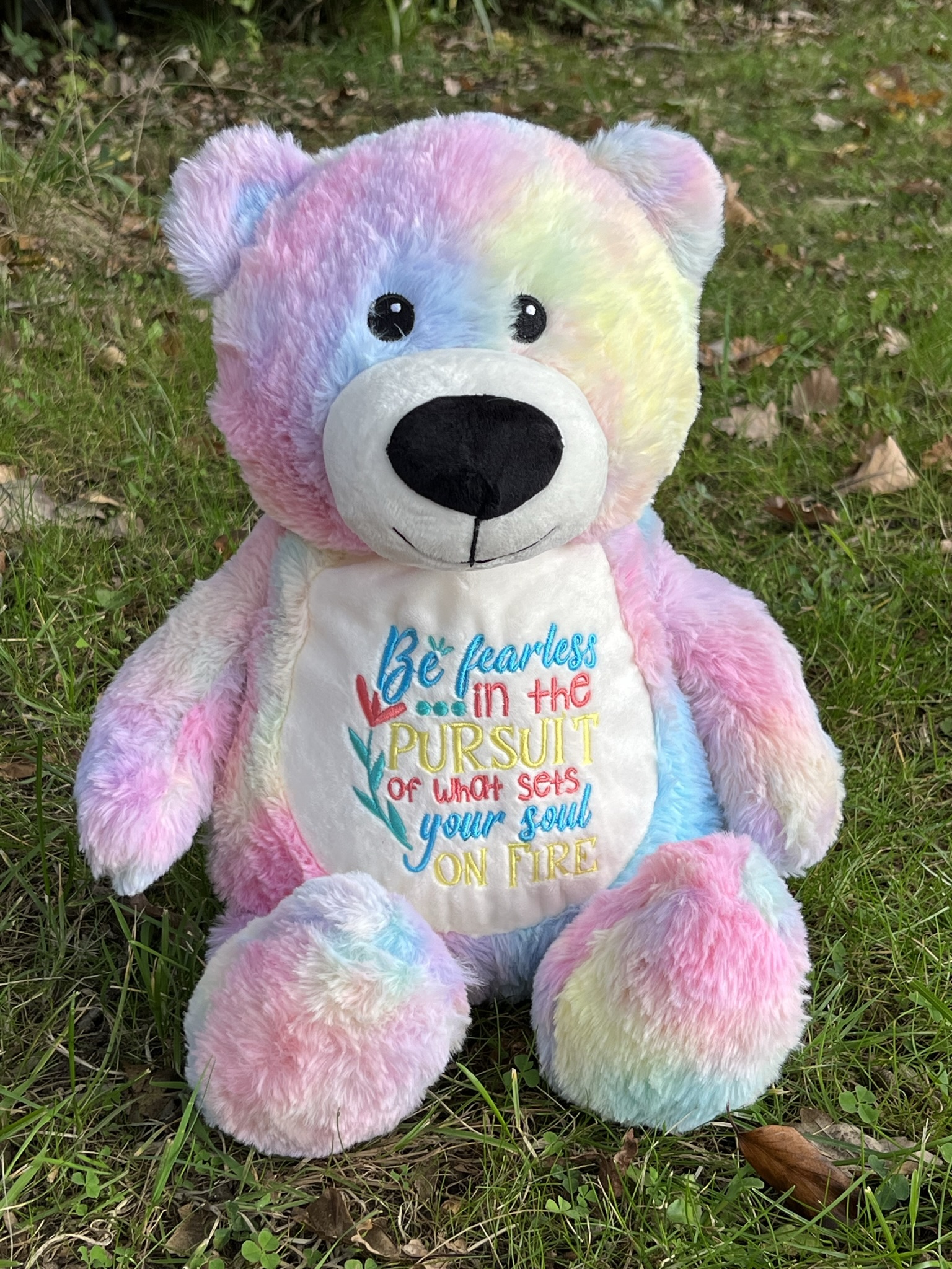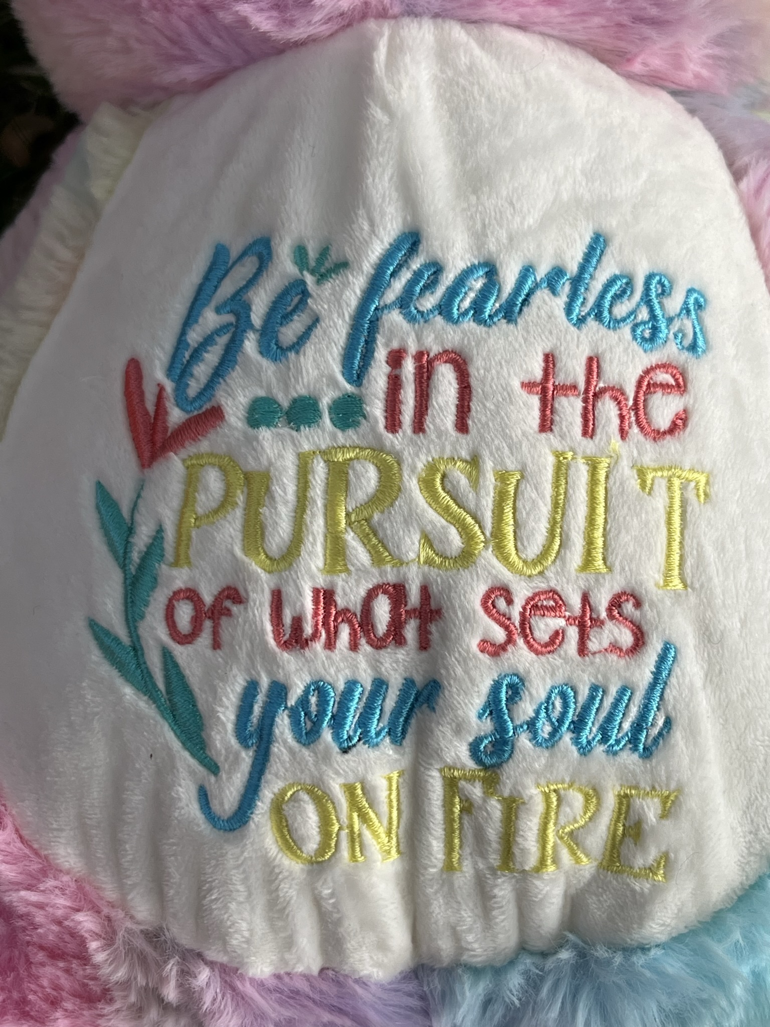 Her tummy design says 'Be fearless in the pursuit of what sets you on fire' and thread colours may vary.