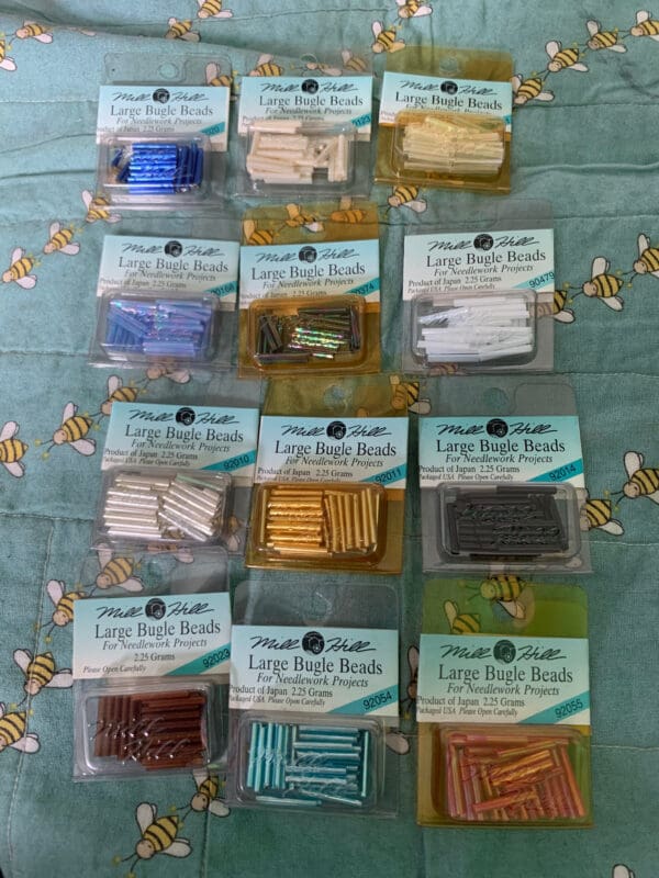 Beads are measured across at the widest point on the outside of the bead and along the length of the bead. Mill Hill Large Bugle Beads are 2.5 mm by 14mm.