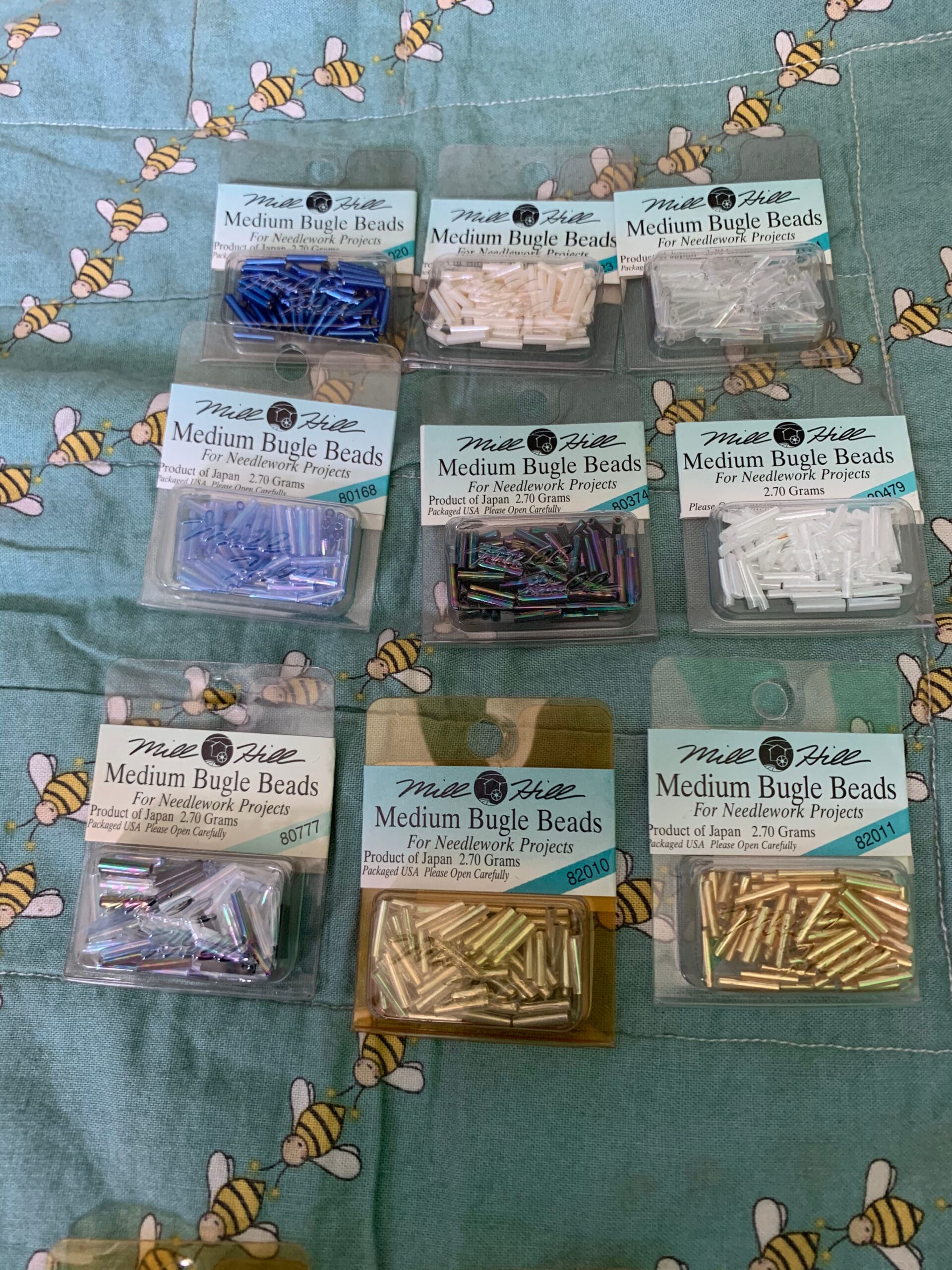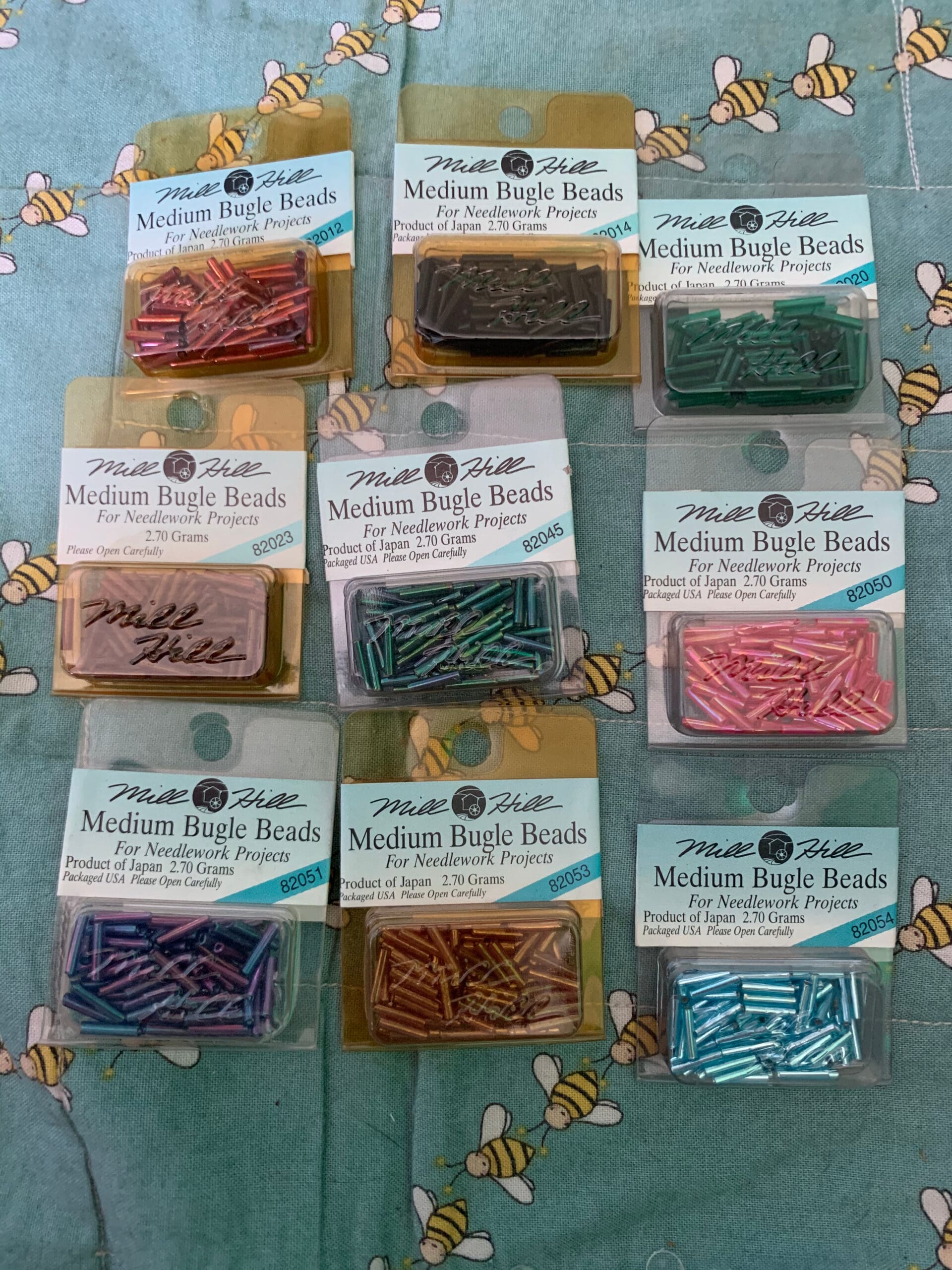 Beads are measured across at the widest point on the outside of the bead and along the length of the bead. Mill Hill Medium Bugle Beads are 2.5 mm by 9mm.