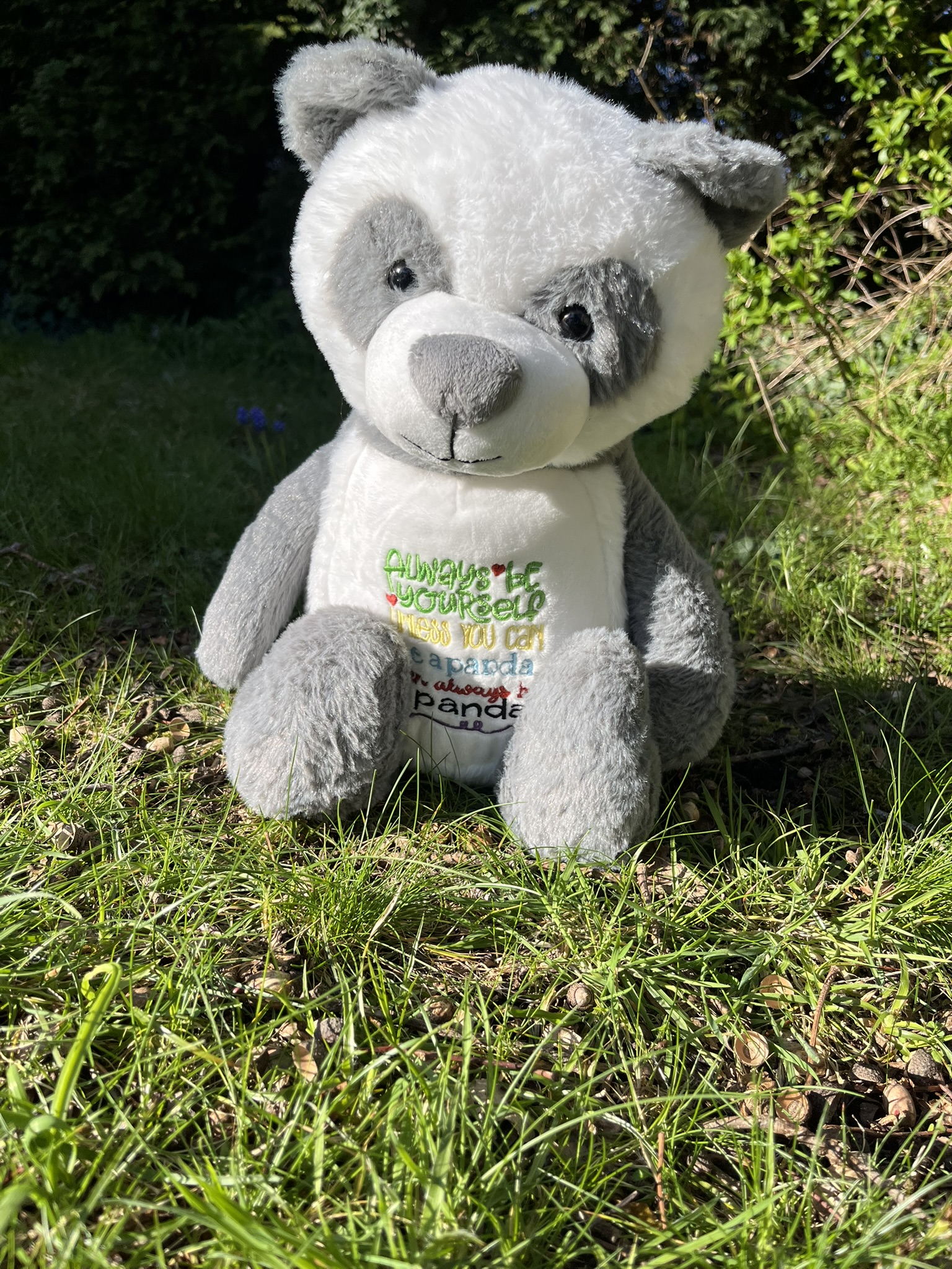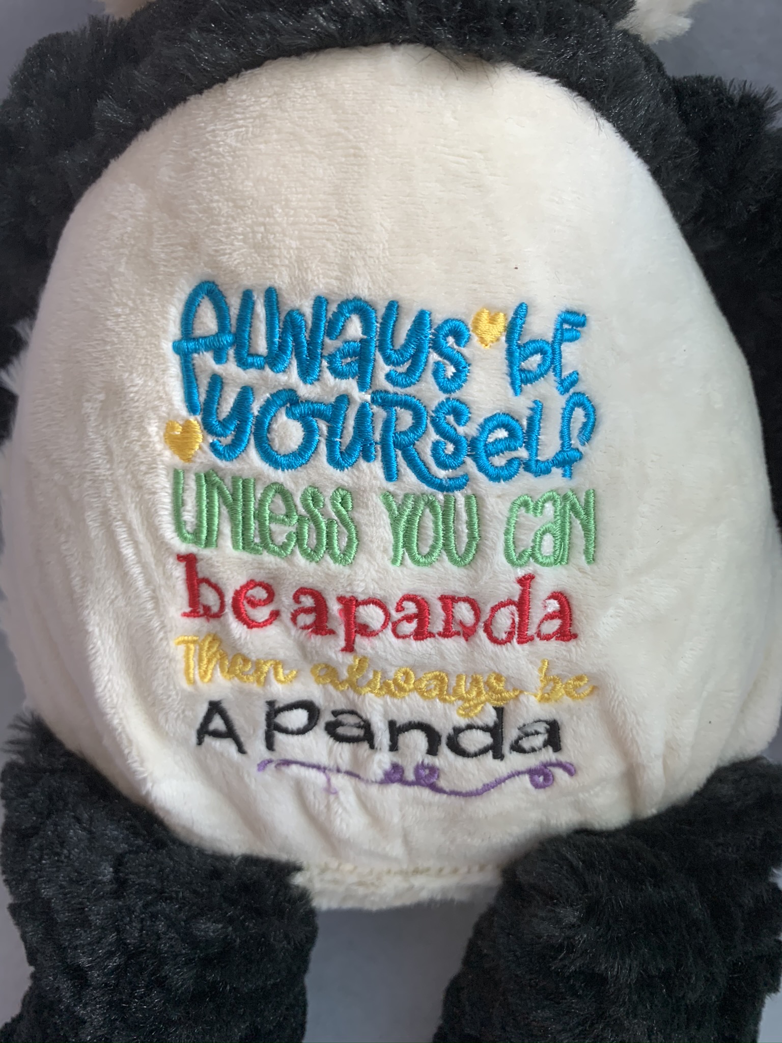 Her tummy design says 'Always be a Panda' and the thread colours may vary.