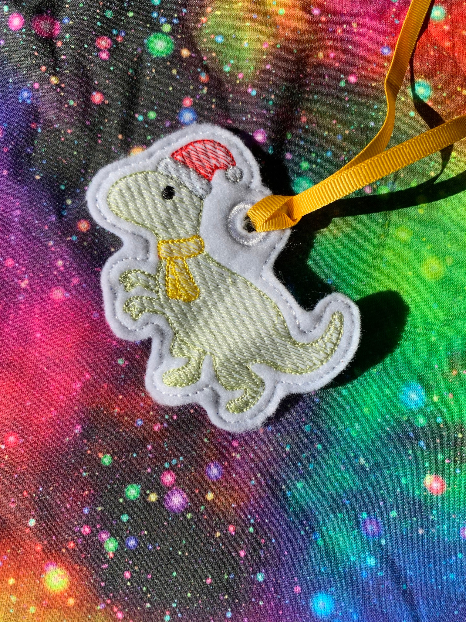 Choose colours for the ribbon and felt backing, to make this your very own dino.