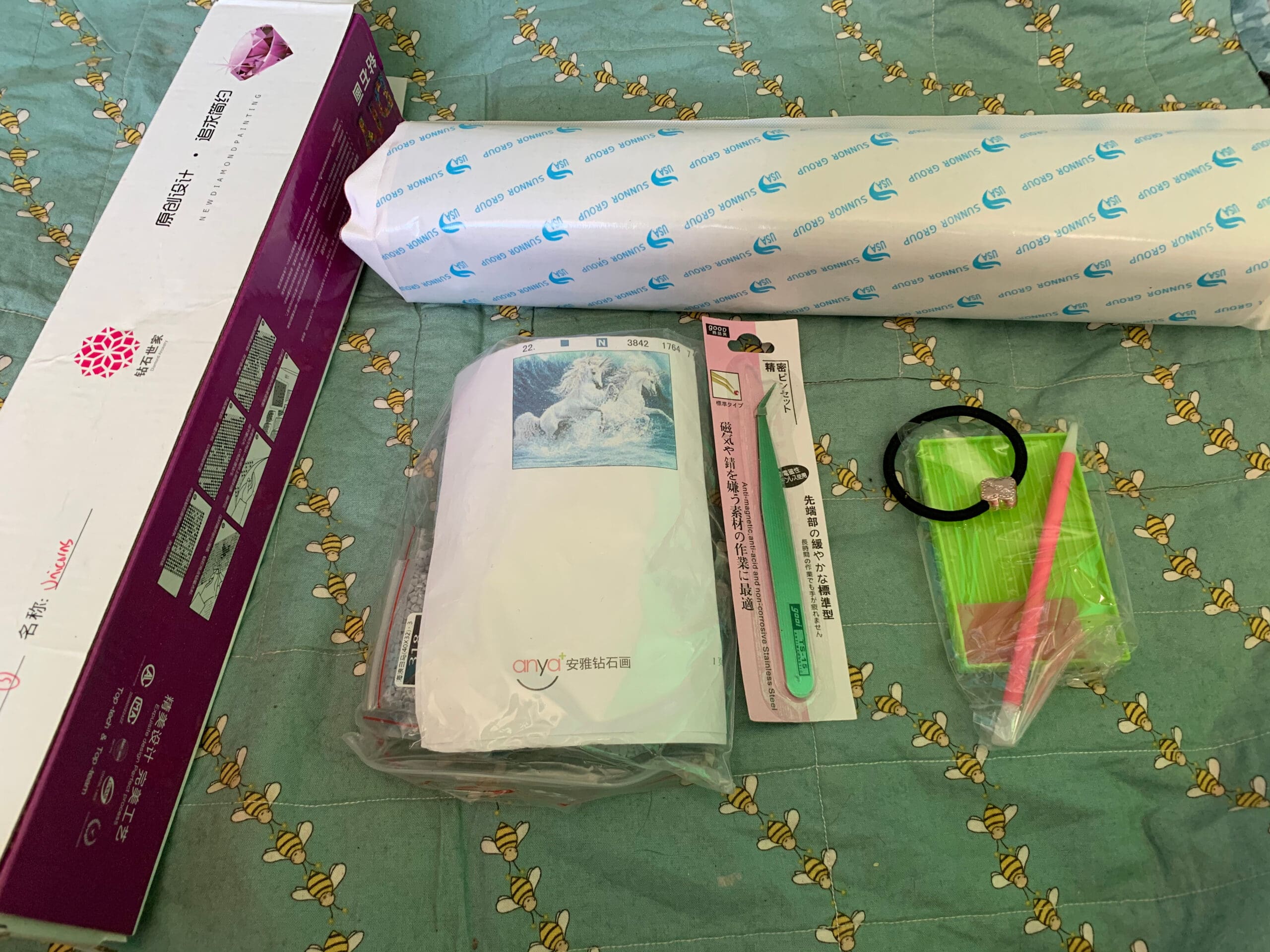 Diamond painting kit contains everything you need to make the picture including tools.