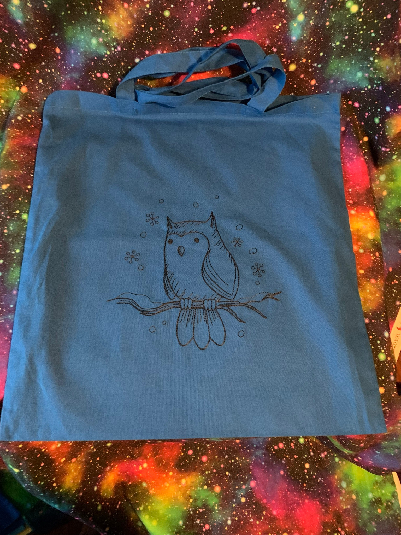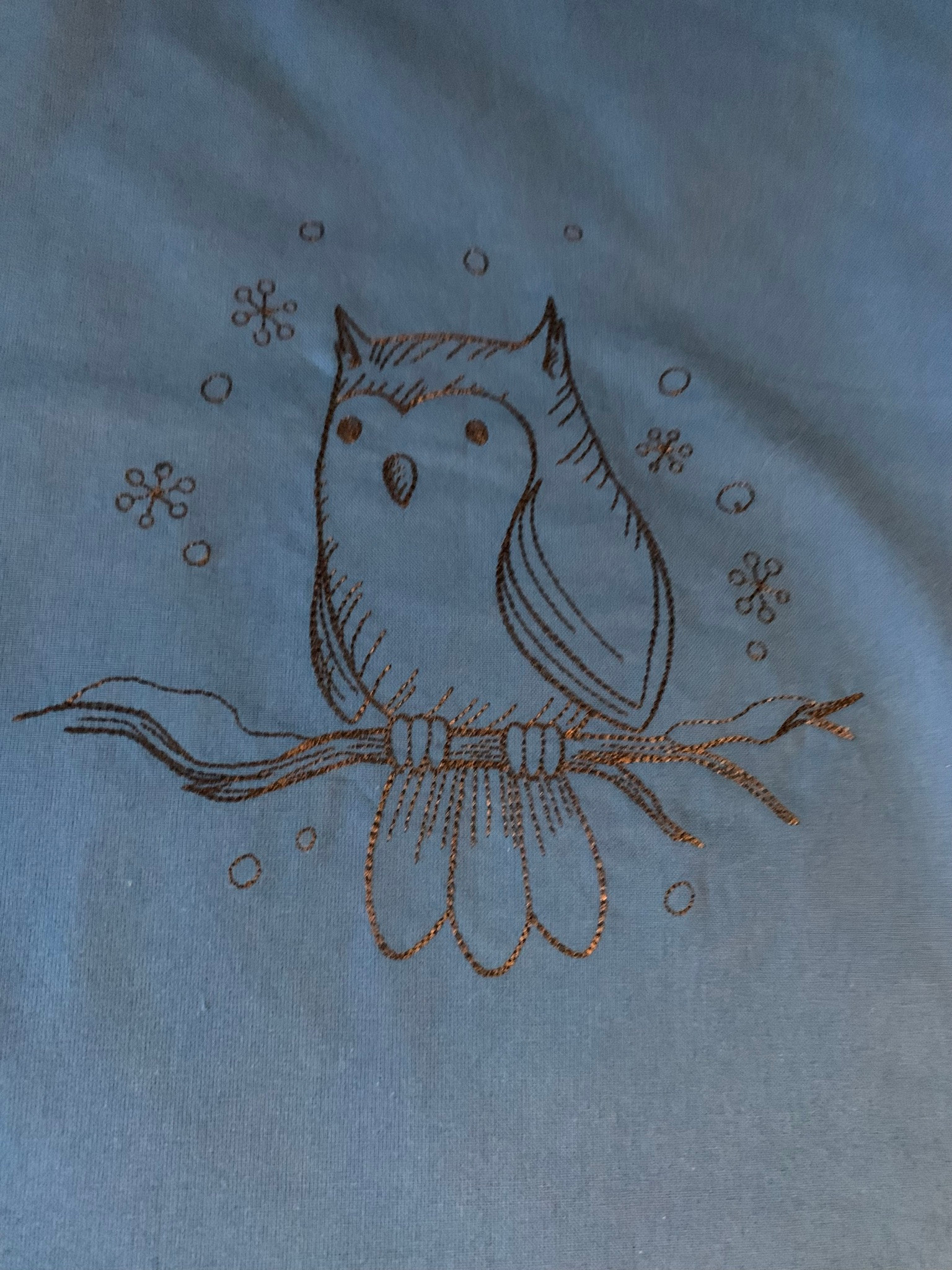 A charming owl enjoys fresh falling snow on this lovely bag.